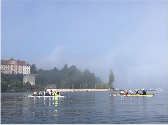 Auch am Freitagmorgen liegt dichter Nebel über dem Bodensee. Wir wagen uns erst aufs Wasser, nachdem die Landspitze von Petershausen sichtbar wird. Dann rudern wir zügig zur malerischen Insel Mainau, die Sicht wird zunehmend besser. Wir überqueren den See zum Pfahlbaumuseum, ein eindrücklicher Anblick.