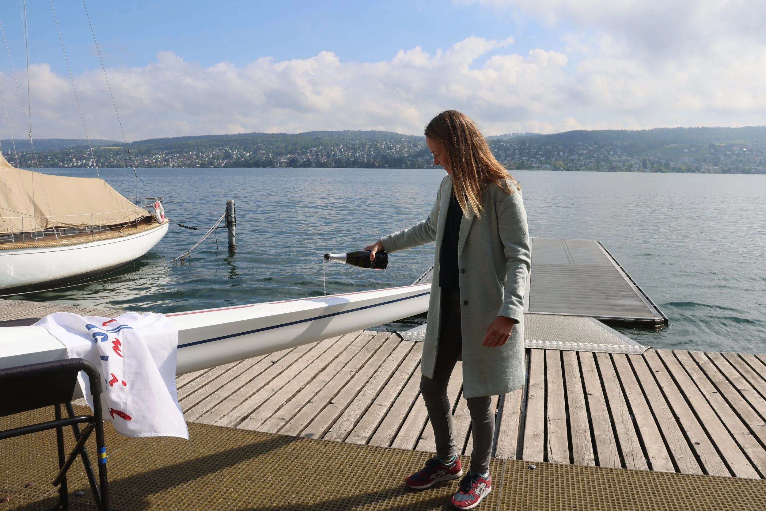 Gut dreissig Clubmitglieder versammelten sich bei strahlendem Wetter vor dem Bootshaus und wurden Zeugen von zwei Bootstaufen. Cara Pakszies hatte die Ehre, einen Doppelzweier zu taufen, mit welchem sie bereits Schweizermeisterin wurde. Dieses Boot heisst ab sofort «Papillon». Ein ungesteuerter Riemenzweier, welcher im Juniorenbereich im Einsatz steht, wurde von Niki-May Fock, assistiert durch ihre Kollegin Anjulie Hathaway, mit einem lateinischen Zitat von Gaius Julius Caesar auf den sinnvollen Namen «Veni, vidi, vici» getauft, was in Deutsch «ich kam, sah und siegte» heisst. Anschliessend wurden die Rennboote mit Champagner beträufelt und den Rest des edlen Weines durften die Besucher geniessen.